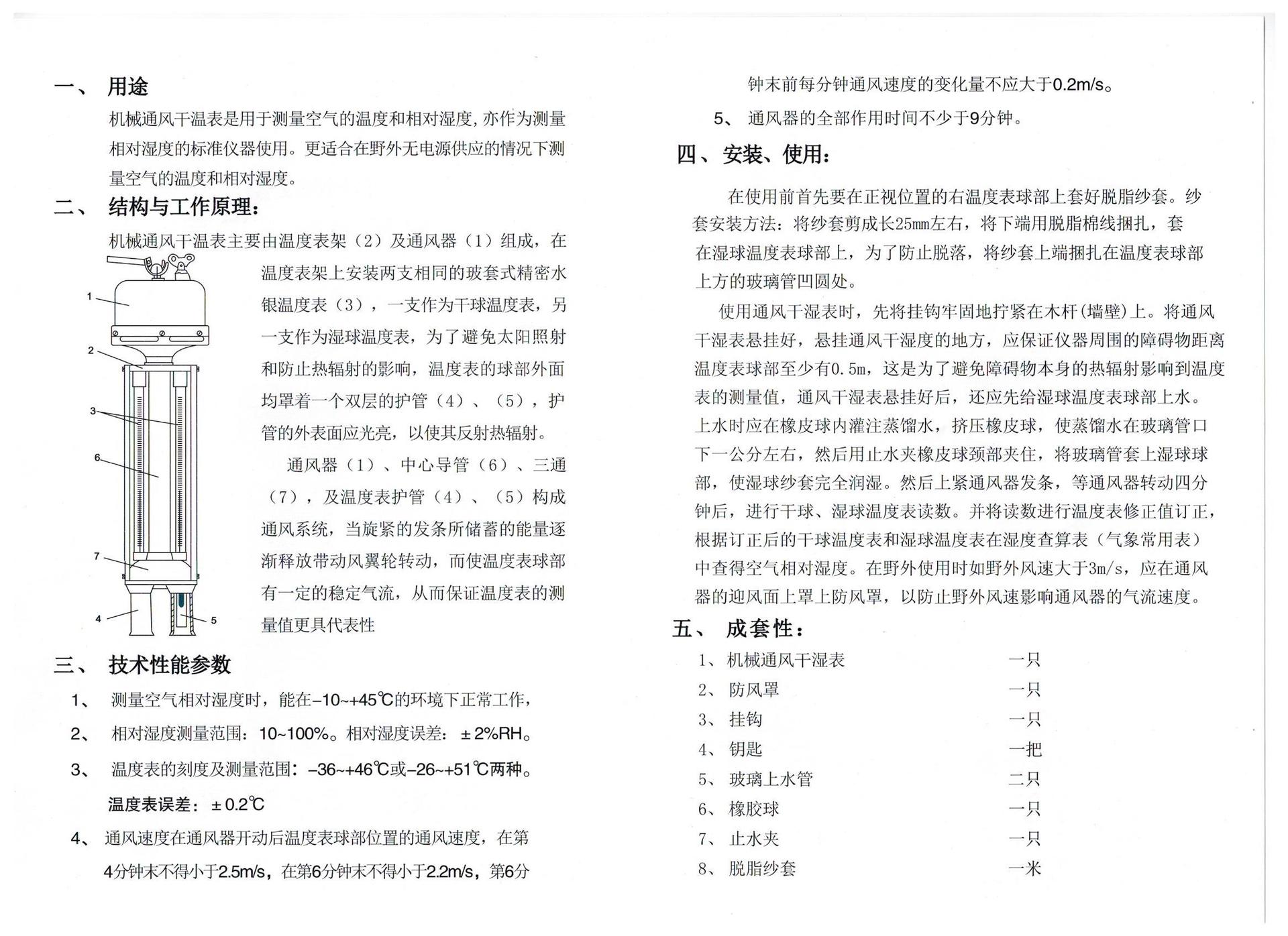 機械通風幹濕表是用於測量空氣的溫度和相對濕度,亦作為測量相對濕度的標準儀器使用。更適合在野外無電源供應的情況下測量空氣的溫度和相對濕度。測量空氣相對濕度時,1,能在一10~﹢45℃的環境下正常工作,2,相對濕度測量範圍10~100%